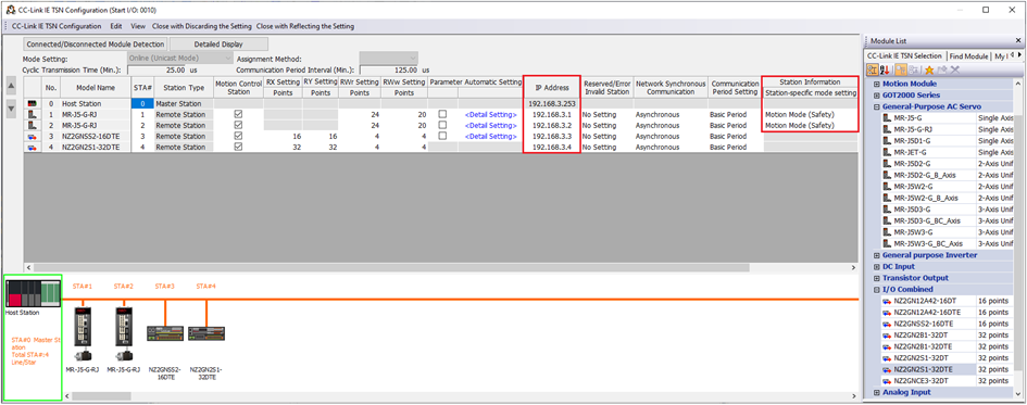 In the Network Configuration Window add devices from Module List to the network configuration. Each device is identified by the IP Address. Network part (first three octets) of IP address is determined by IP Address of master module, last octet needs to be set by switches on slave module (amplifiers and remote IOs). For servos that will use safety communication over CC-Link IE TSN set Motion Mode (Safety) in Station Information column.