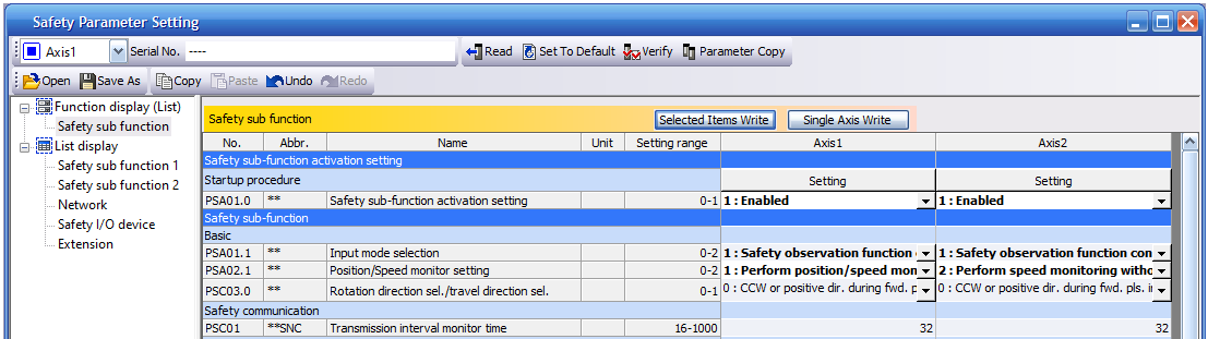 To set safety parameters open Safety Parameter Setting window from navigation tree. Set parameters like bellow to activate Functional Safety via communication.