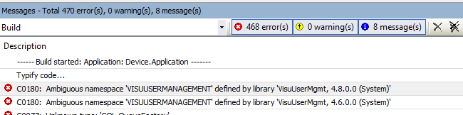 After creating a new project for the GOC43 in Codesys there is a really high possibility of errors after clicking Generate Code or Log In. After that, in the messages window, a high number of errors will occur like in the example screen below: