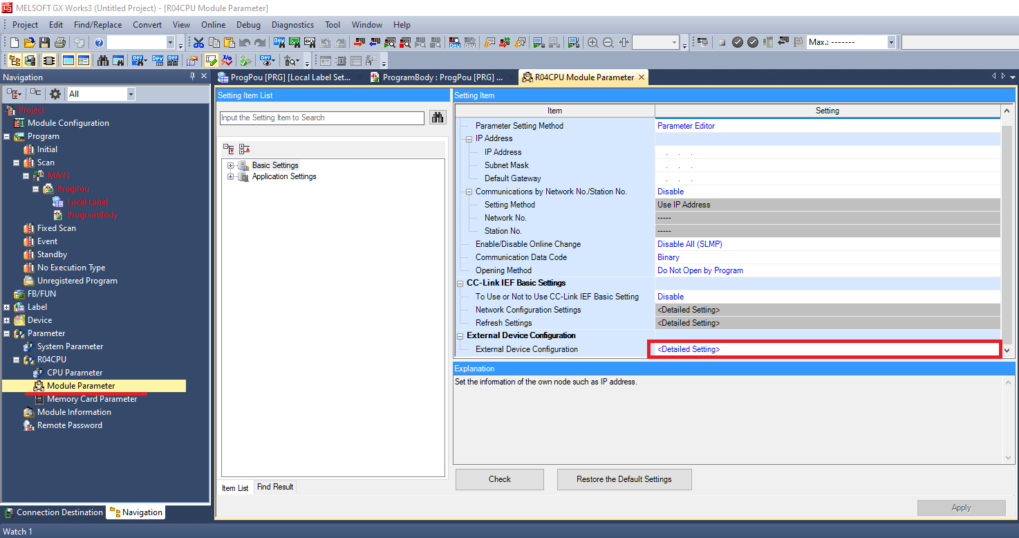 Then from the Module Parameter tab please open External Device Configuration -> Detailed Setting.