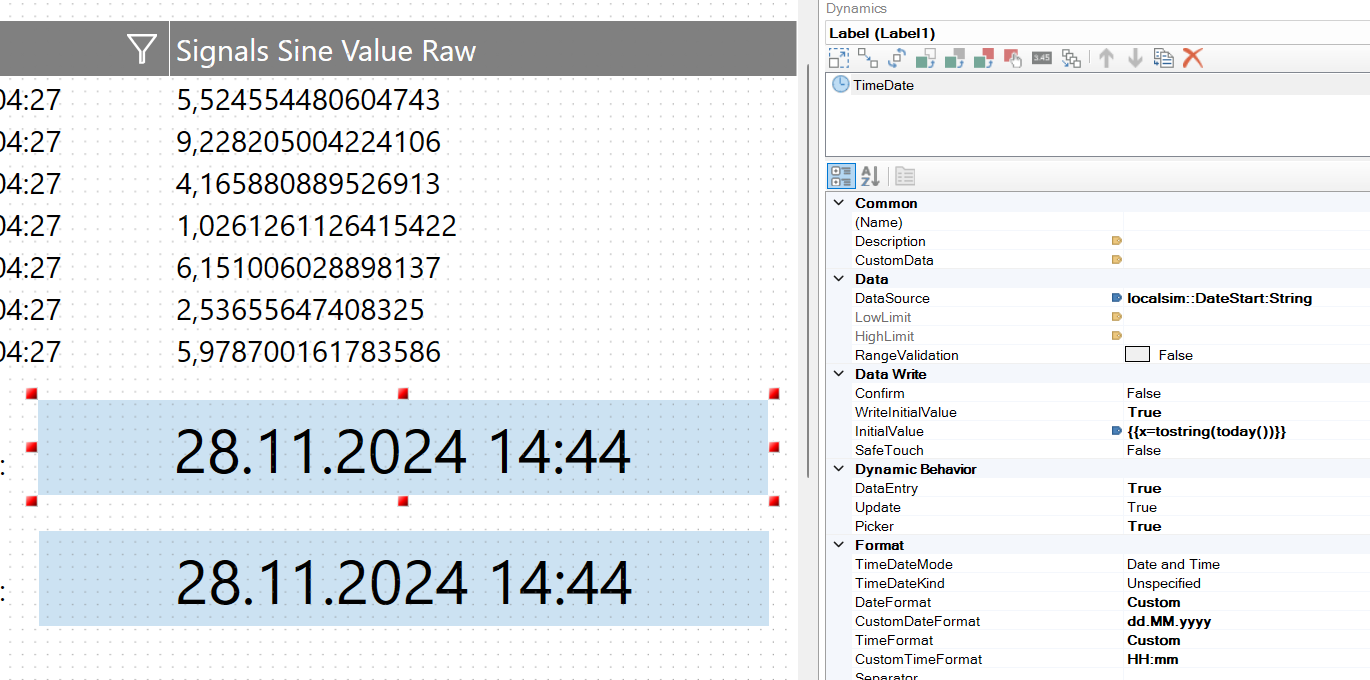 To let the operator modify the time range in Runtime, the local variables can be connected to a Label with the TimeDate dynamic. Use the DateFormat and TimeFormat parameters of the dynamic to set the format you want: