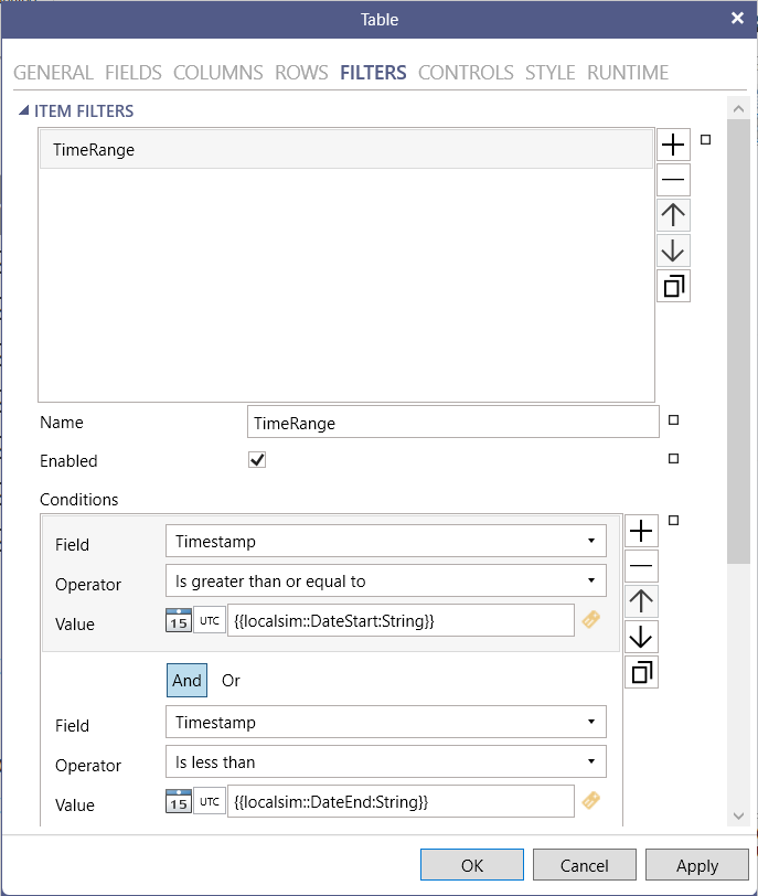 In GraphWorX, data presented in a Table control can be filtered using local variables. When presenting historical data, the most commonly used filter is limiting the Timestamp range, which can be done in the Filters tab of table settings like this: